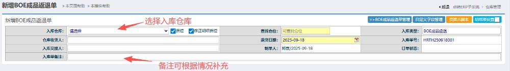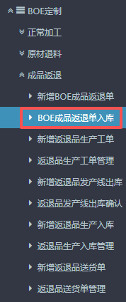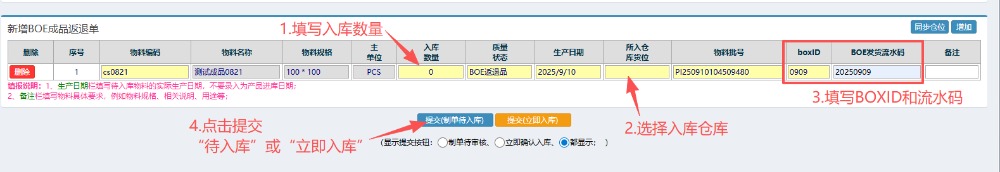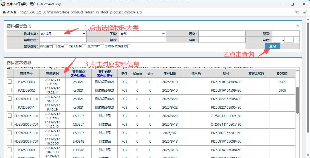 2.进入界面后,按图操作:点击选择入库仓库。备注可根据情况补充。 3.接下来在下方点开“物料编码”,会弹出物料信息界面。 在弹出的窗口内,按图操作:点击选择物料大类,点击查询。然后再点击对应的物料信息 注:如果找不到可以填写“编码”或“名称”进行筛选 4. 选好物料后,按图操作:填写入库数量,选择入库仓库(要与上面一致),填写BOXID和流水码。根据情况选择提交“待入库”或“立即入库”。 注:BOXID和流水码在“新增BOE组件来料单”的流程中已经填过的了,可以在“BOE组件来料单入库”里查看 5.提交完成后,回到左侧功能菜单找到“BOE成品返退单入库”。 6.进入界面后,按图操作:可用“代码”或“名称”筛选,点击查询。然后点击对应物料信息,先进行入库,再上传BOE。 流程结束。 下一步流程跳转教程链接: 点晴ERP-BOE返退品生产工单流程 点晴模切ERP更多信息:http://moqie.clicksun.cn,联系电话:4001861886 该文章在 2025/10/20 10:33:44 编辑过 |