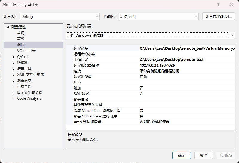 ![]() 或者官网下载 Remote Tools 安装包,下载地址:微软官方 Remote Tools 在测试机(或者虚拟机)里打开 ![]() 然后,在菜单栏-工具-选项,选择无身份验证(测试环境方便)或配置 Windows 身份验证。 ![]() 部署调试版本程序在开发机上将 Debug 版本对应的可执行文件(包括 exe、dll、pdb 文件)拷贝到测试机(或者虚拟机),确保能够正常运行。 配置远程调试方法一右键单击项目并选择 属性。打开 调试 选项卡。 将“要启动的调试器”更改为“远程 Windows 调试器”。 ![]() ![]() 配置相关属性: