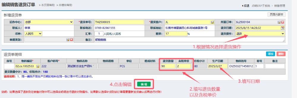 ![]() ![]() 1.进入ERP系统后,在左侧功能菜单里找到“销售管理”,点开“销售退货单管理”,“退货单明细管理” 2.进入界面后,按图操作:先点击查询,然后找到对应退货单点击编辑。 3.点击编辑进入页面后,按图操作:根据情况选择退货操作(退款、补货),填写退货数量、含税单价以及日期。点击编辑。 流程结束。 点晴模切ERP更多信息:http://moqie.clicksun.cn,联系电话:4001861886 该文章在 2025/9/24 9:30:30 编辑过 |