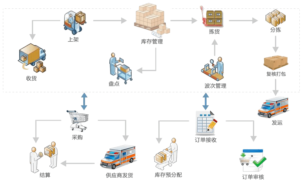 精细化库存管理:点晴WMS系统按照收货、拣货、盘点、库内加工等工序将库内作业进行细分;作业任务自动分配给对应的操作员进行作业。