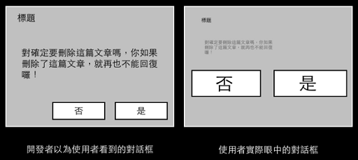对话框最常见的不当设计就是选项上的文字出现:「是(YES)与否(NO)」,回想在学生时期考试的时候,O 与 X 在是非题中是唯二的两个答案,而出题者会透过文字叙述上正反的误导,来测验学生是否真的清楚了解,先不论这样的测验方式到底对学习以及知识的建立到底有没有明显的帮助,使用者可不想在开心的使用你的程序或服务时,还要小心翼翼的了解你对话框的内容。 我们当然可以细心的设计对话框中的文字,让用户清楚明了对话框的讯息,但是在大部分的情况下,我们几乎根本不会逐字去阅读讯息的内容。