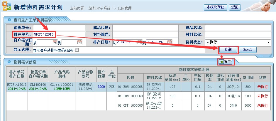 操作步骤:生产管理——排产管理——新增物料需求计划;进入页面如下图操作: