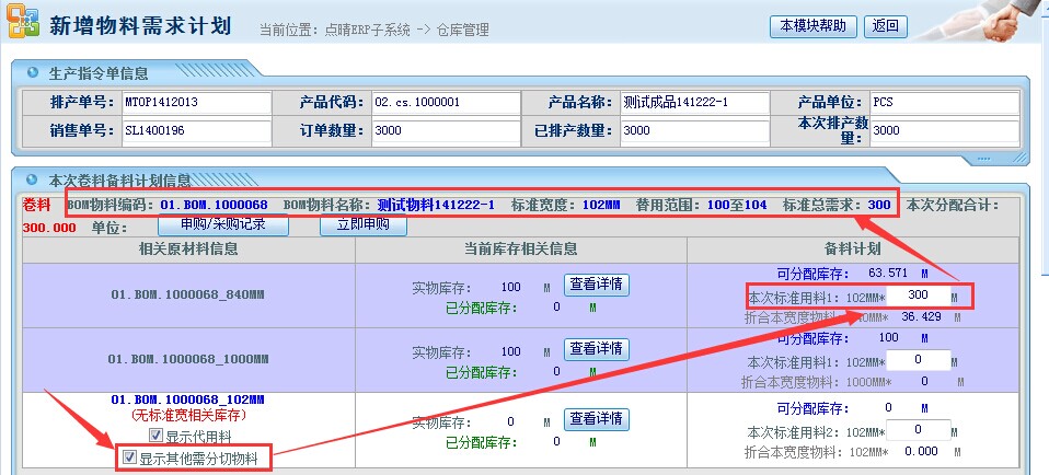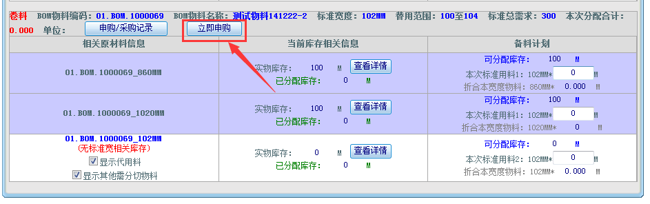 进入此页面,能看到详细的物料需求以及该物料其他的规格库存情况。根据标准需求填写数值(上图显示标准用料102MM需求300M,最后折合现有库存840MM宽,63.571M,库存现有数值为100M,满足生产需求)。