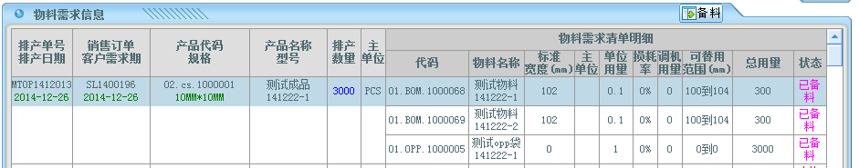 进入页面,按照排产单号进行查询,选中需要做备料计划的单据,点击“备料”按钮,进入如下图所示页面: