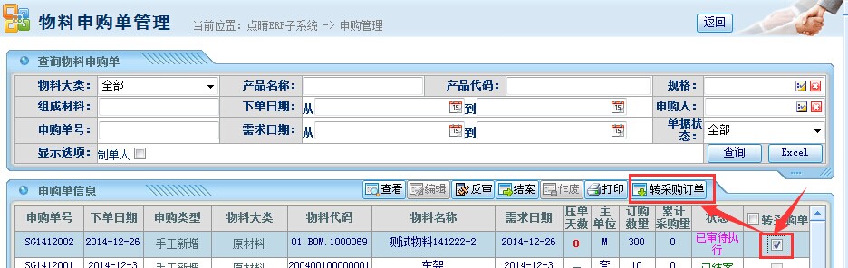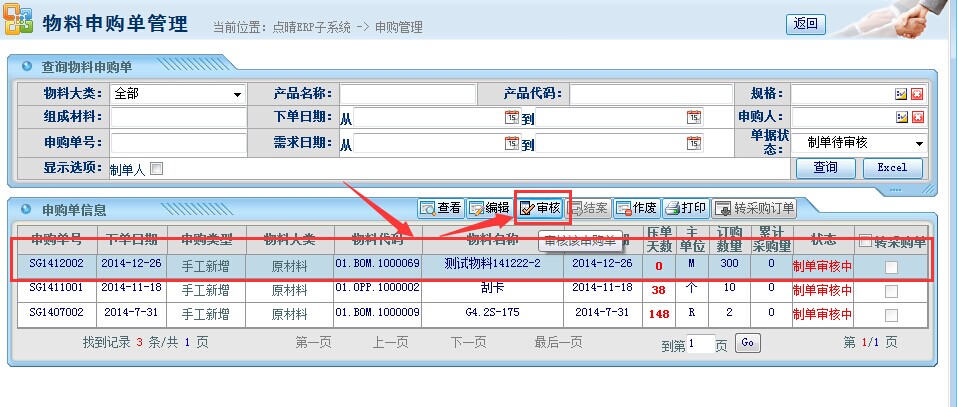 选择申购单,点击“审核”即可。审核完成后,如下图所示: