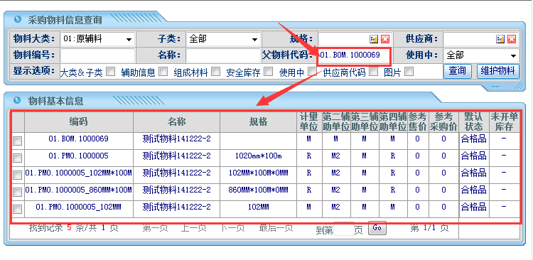 点击“增加”,出现对应物料的所有规格的物料信息;可供下采购单人员任意选择。